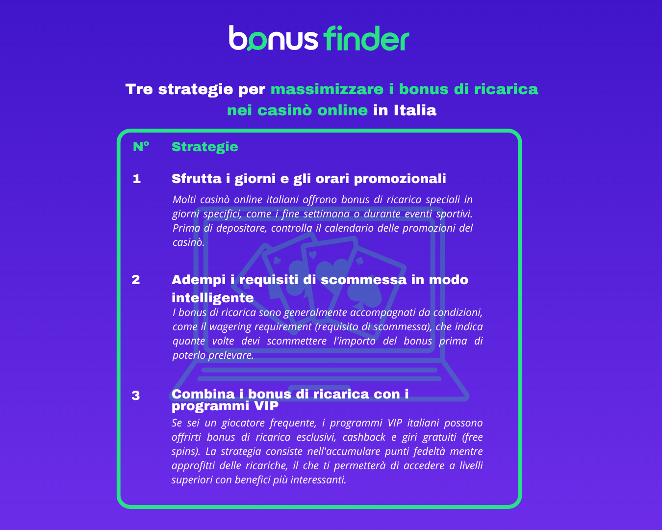 I bonus di ricarica sono generalmente accompagnati da condizioni, come il wagering requirement (requisito di scommessa), che indica quante volte devi scommettere l’importo del bonus prima di poterlo prelevare. Per massimizzarlo: